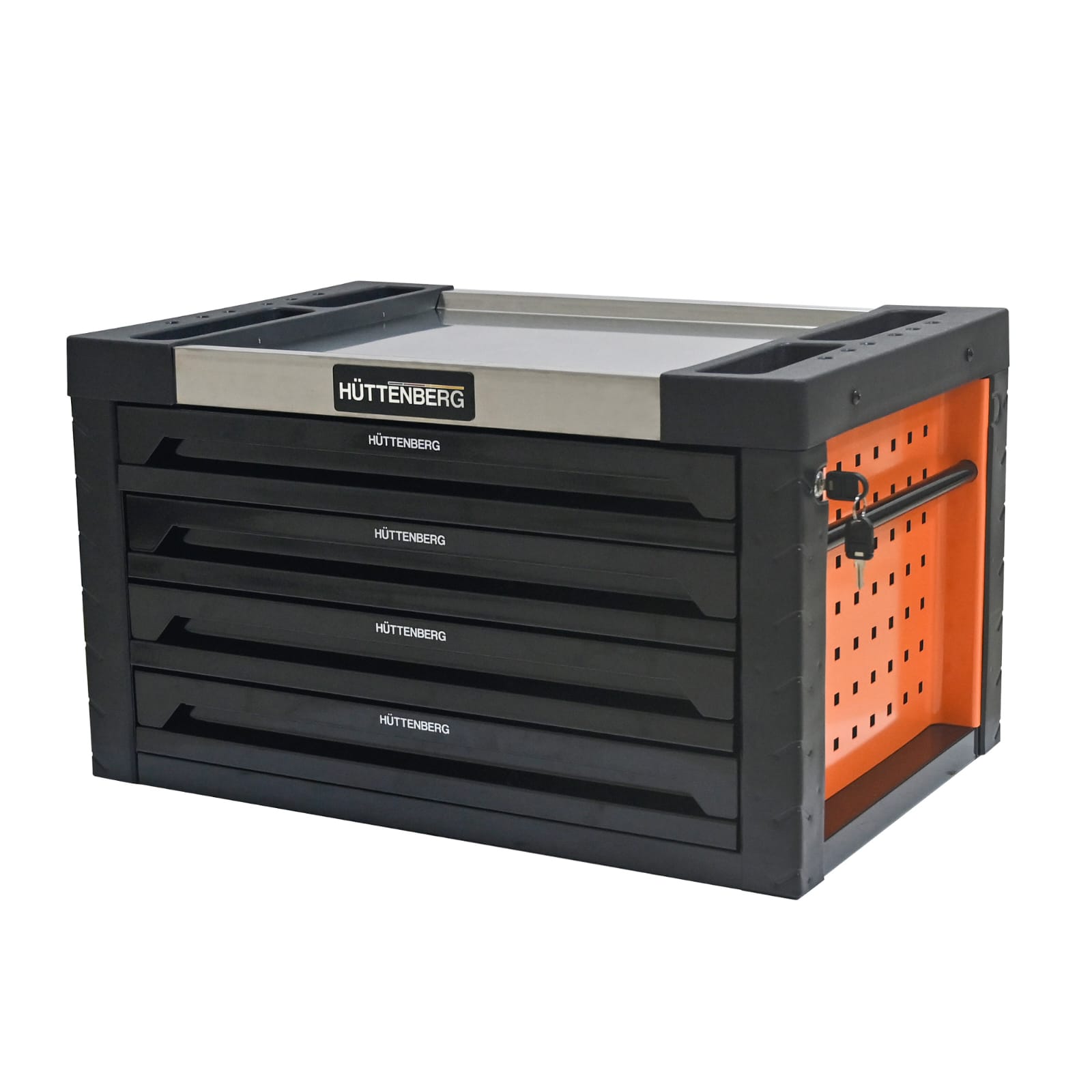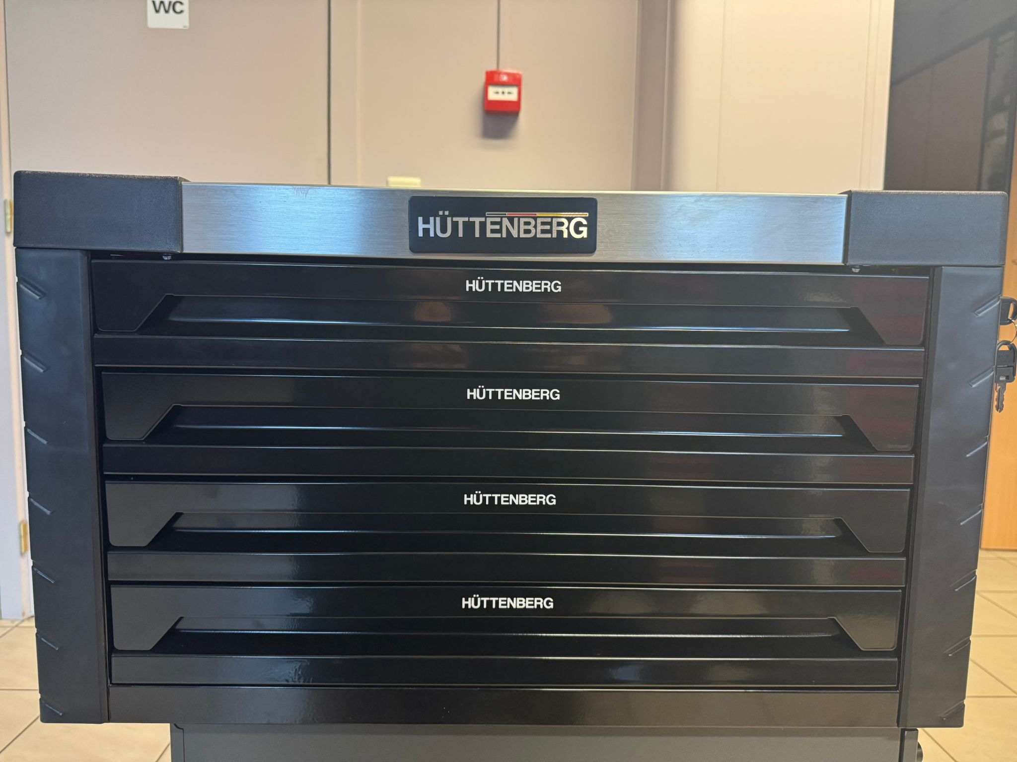 Cette mini-servante Huttenberg d’atelier comporte 4 tiroirs remplis d’outils.