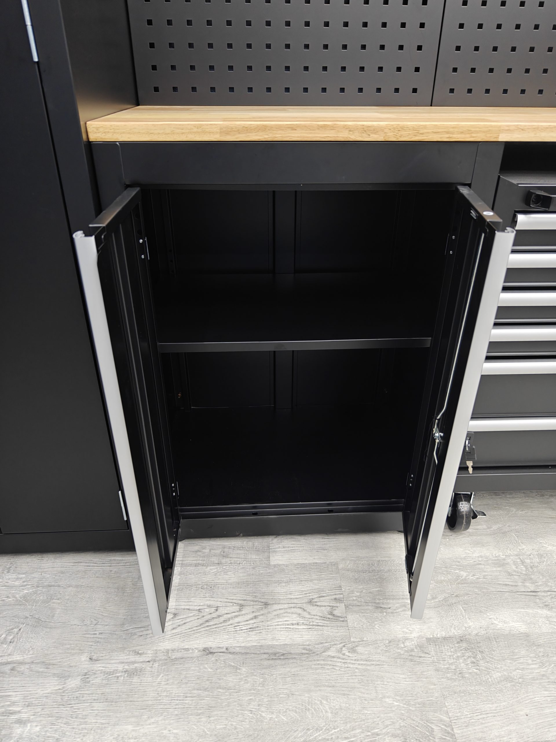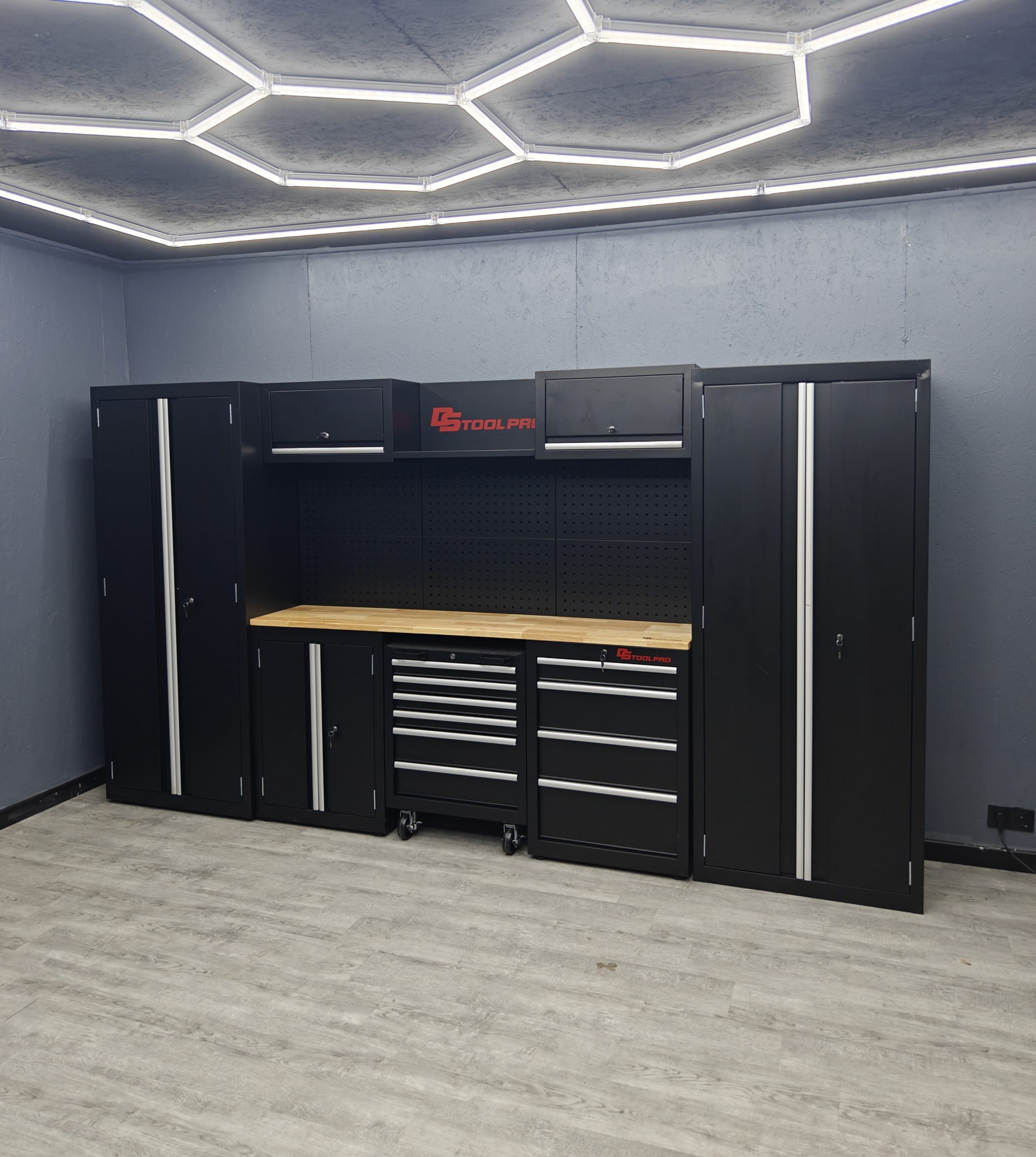 Equipez efficacement votre garage ou atelier avec ce meuble de rangement complet. Conçu pour offrir un espace structuré et fonctionnel, cet ensemble combine rangements bas, hauts, tiroirs et surfaces de travail. Parfait pour garder vos outils et accessoires toujours à portée de main et bien ordonnés.