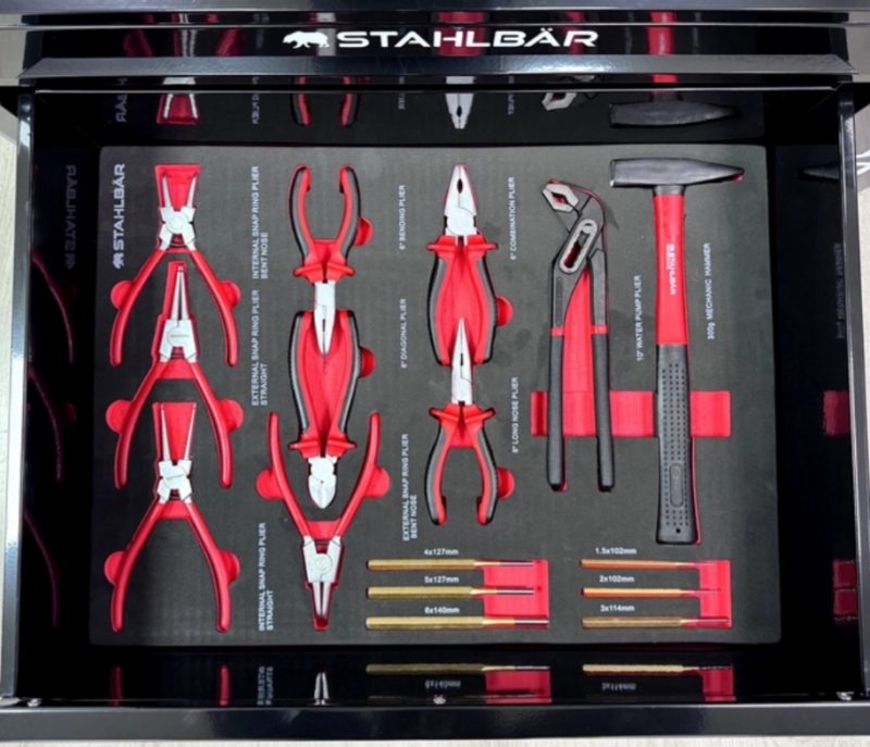 • 6e tiroir : assortiment de pinces, pince a circlips, marteau + chases goupilles