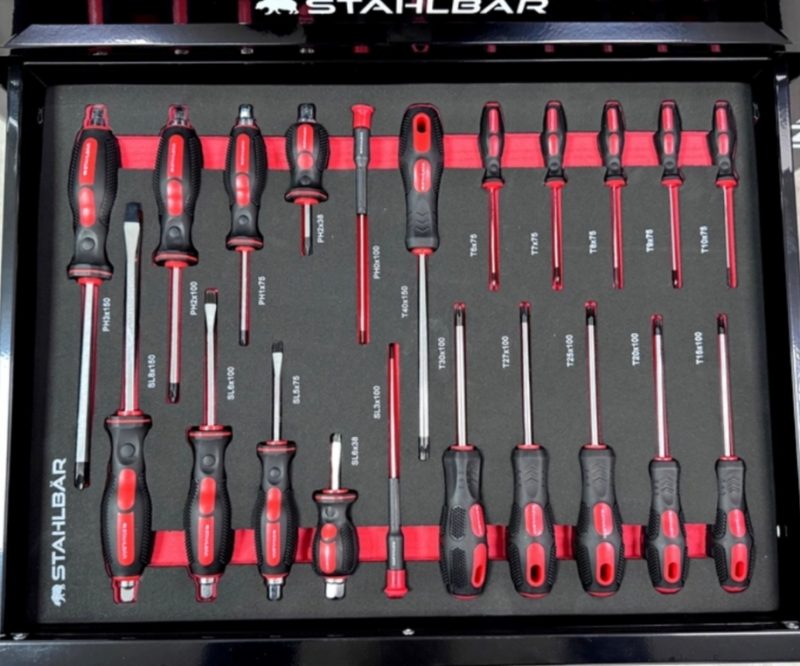 • 4e tiroir : assortiment de tournevis cruciforme plat + isolés électriciens + torx