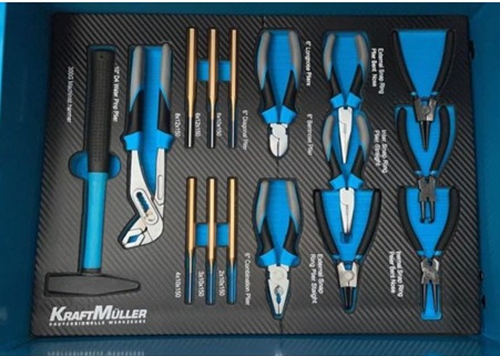 • 5e tiroir : assortiment de pinces a circlips + pince coupante + pinces a becs + marteau