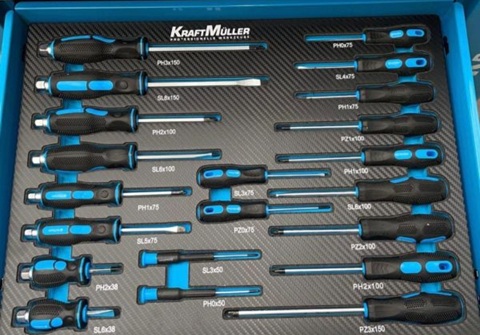 • 4e tiroir : assortiment de tournevis cruciforme plat + torx