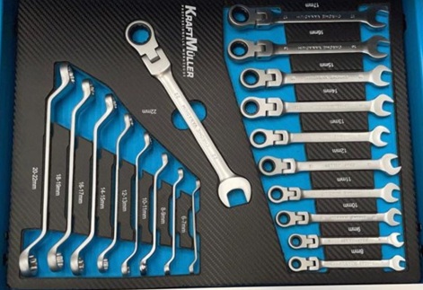 • 3e tiroir : lot de clefs plates de 8 a 22mm à oeil cliquet articulés + clés bi-coudées a oeils