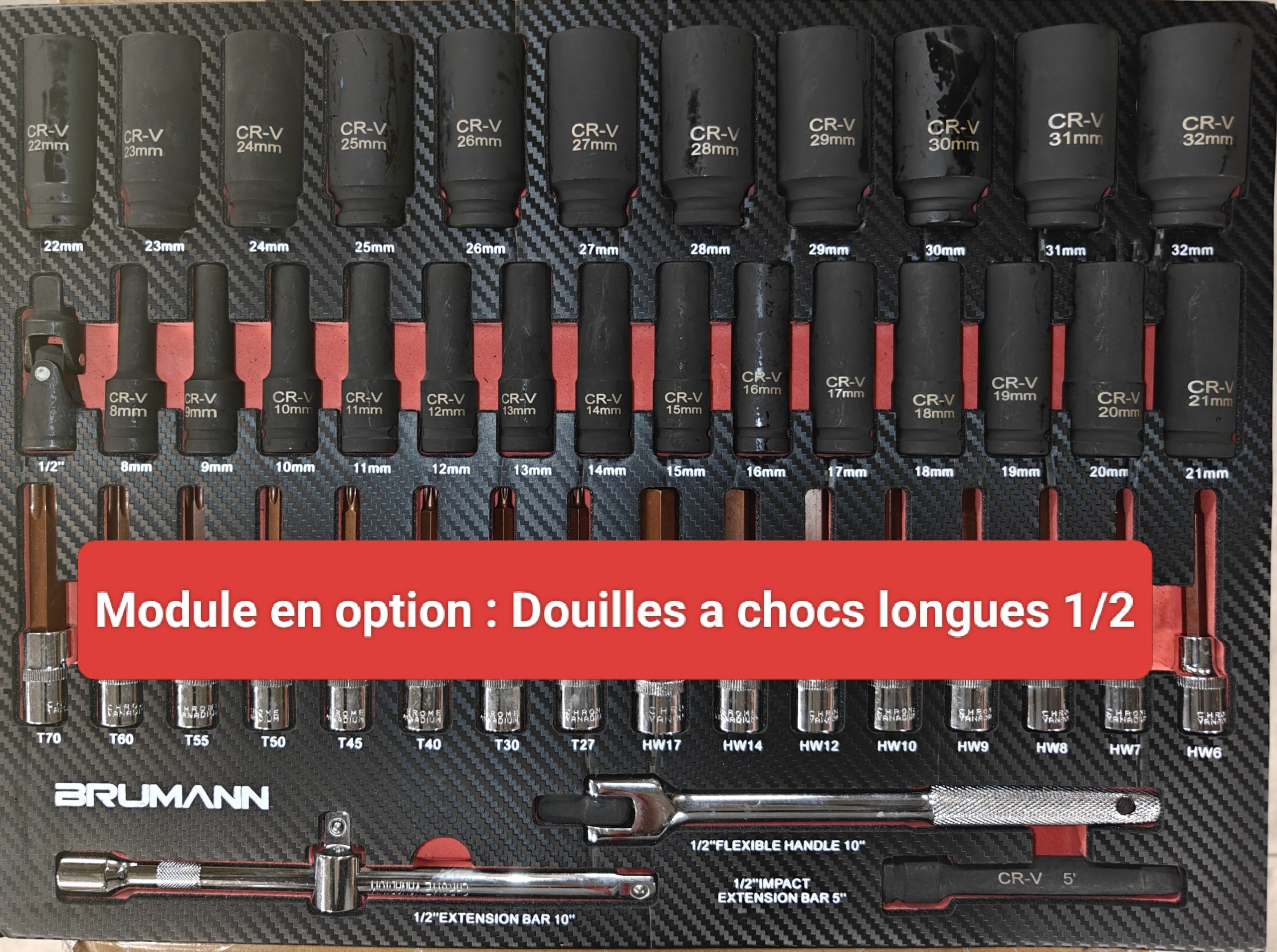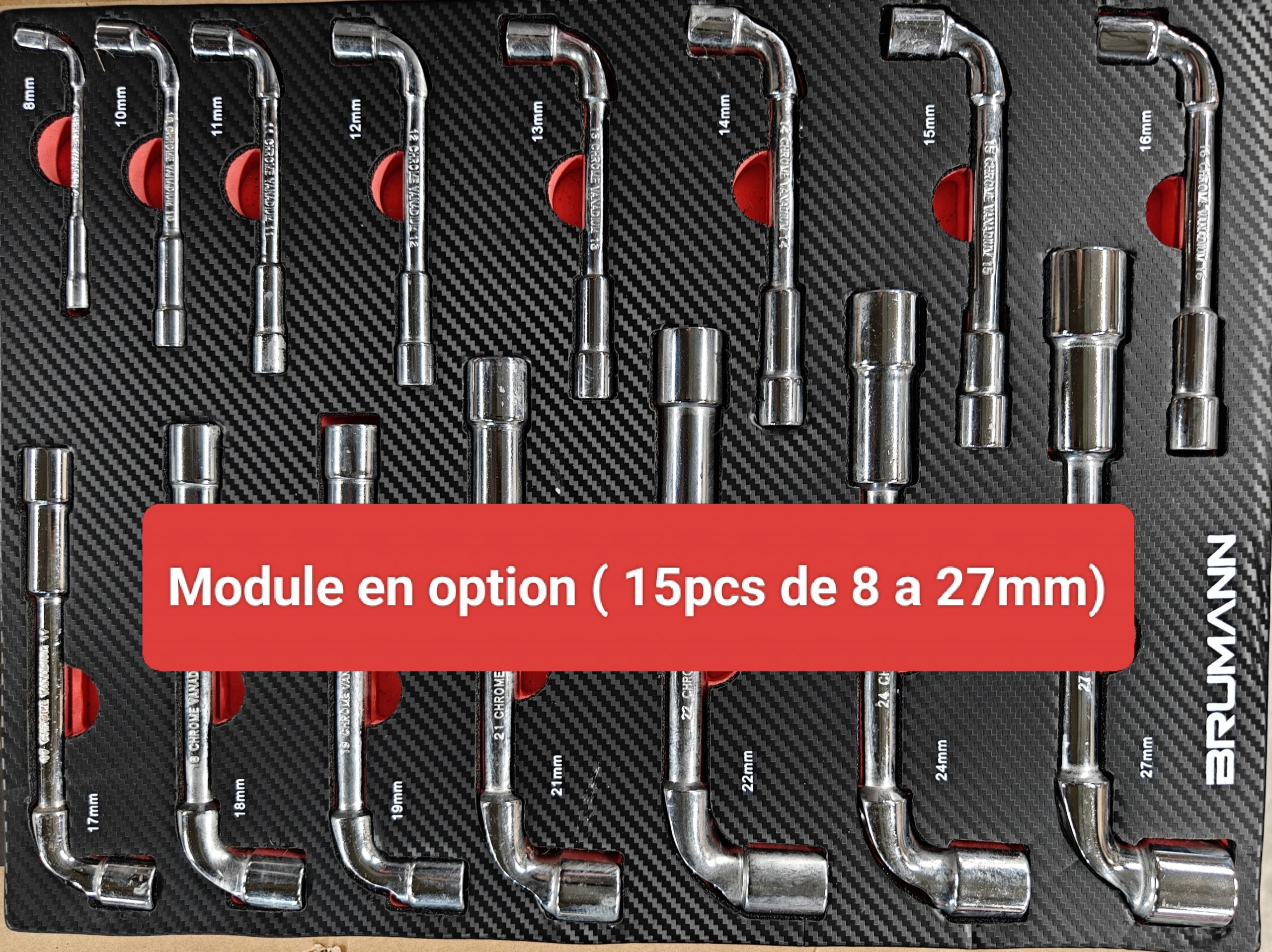 En nouveauté les douilles 1/2 de 16 et de 18mm sont incluse dans la composition d’outils. La clé plate a cliquet de 24mm a ete ajoutée ainsi que les clés mixtes 27/30/32mm, le module de clés en T a douilles en option accueil lui plus de taille avec la 17 et 19mm en plus.