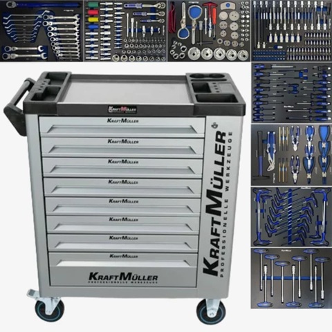 Cette servante d’atelier XL Kraftmuller Pro, dotée d’un plateau supérieur en aluminium et de 8 tiroirs outillés, est indispensable dans votre garage ou dans votre atelier.