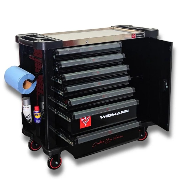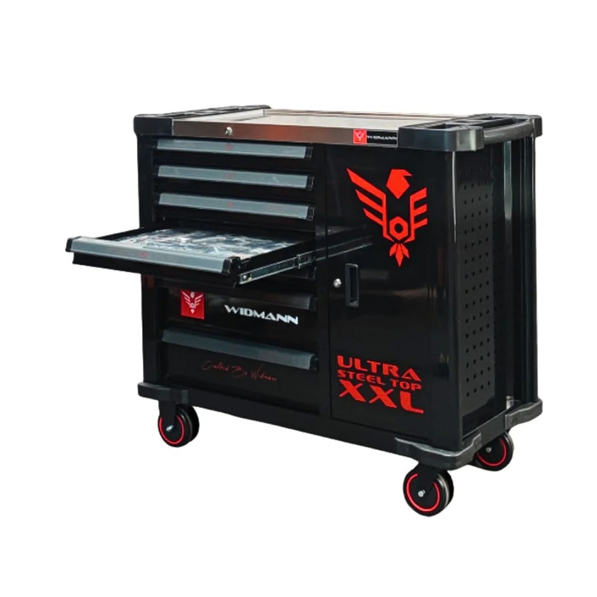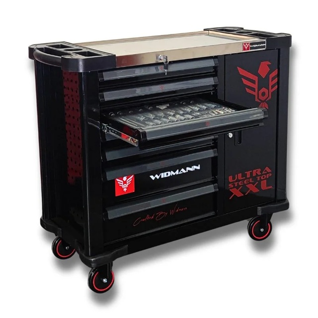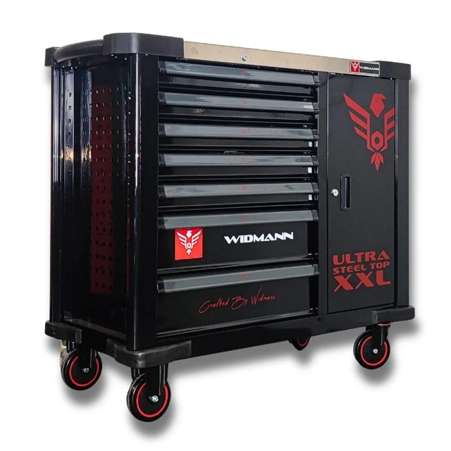 Cette servante d’atelier XXL WIDMANN, dotée d’un plateau supérieur en aluminium et de 6 tiroirs outillés, est indispensable dans votre garage ou dans votre atelier.