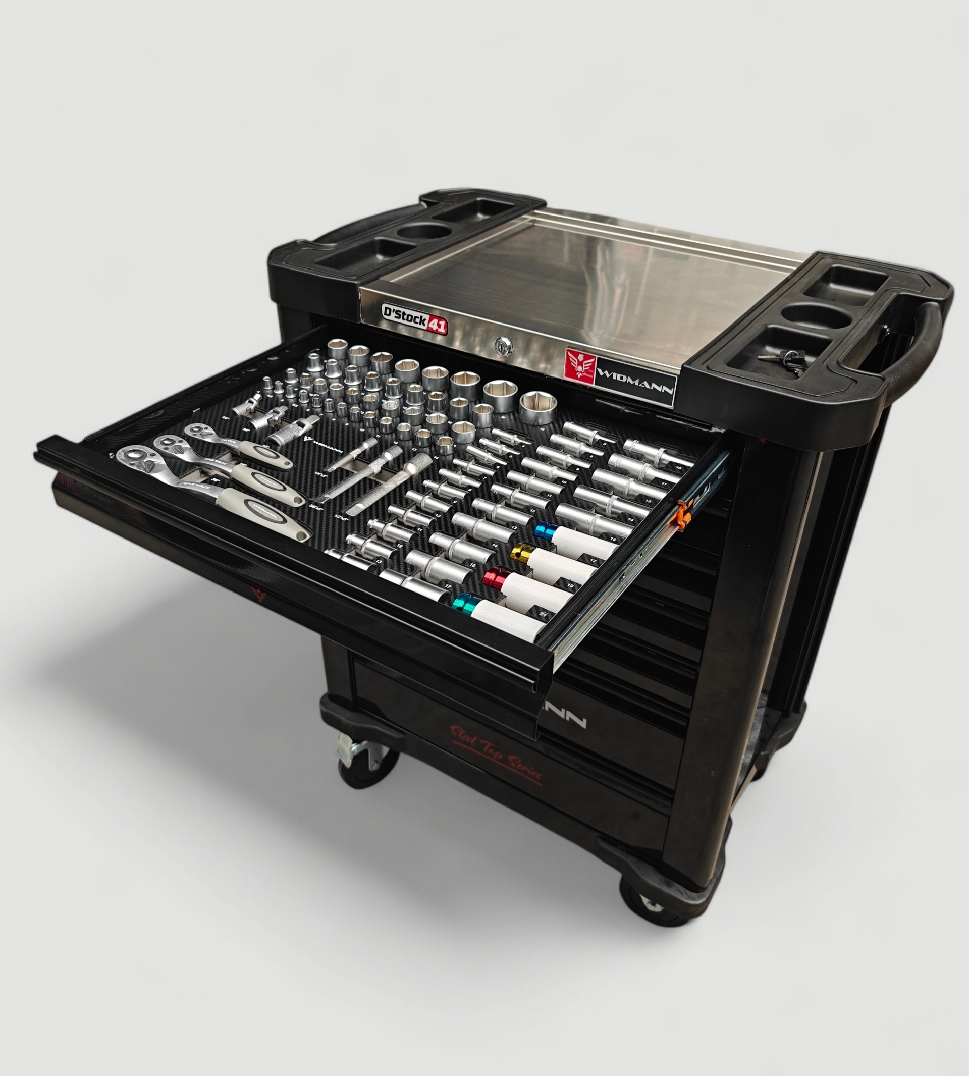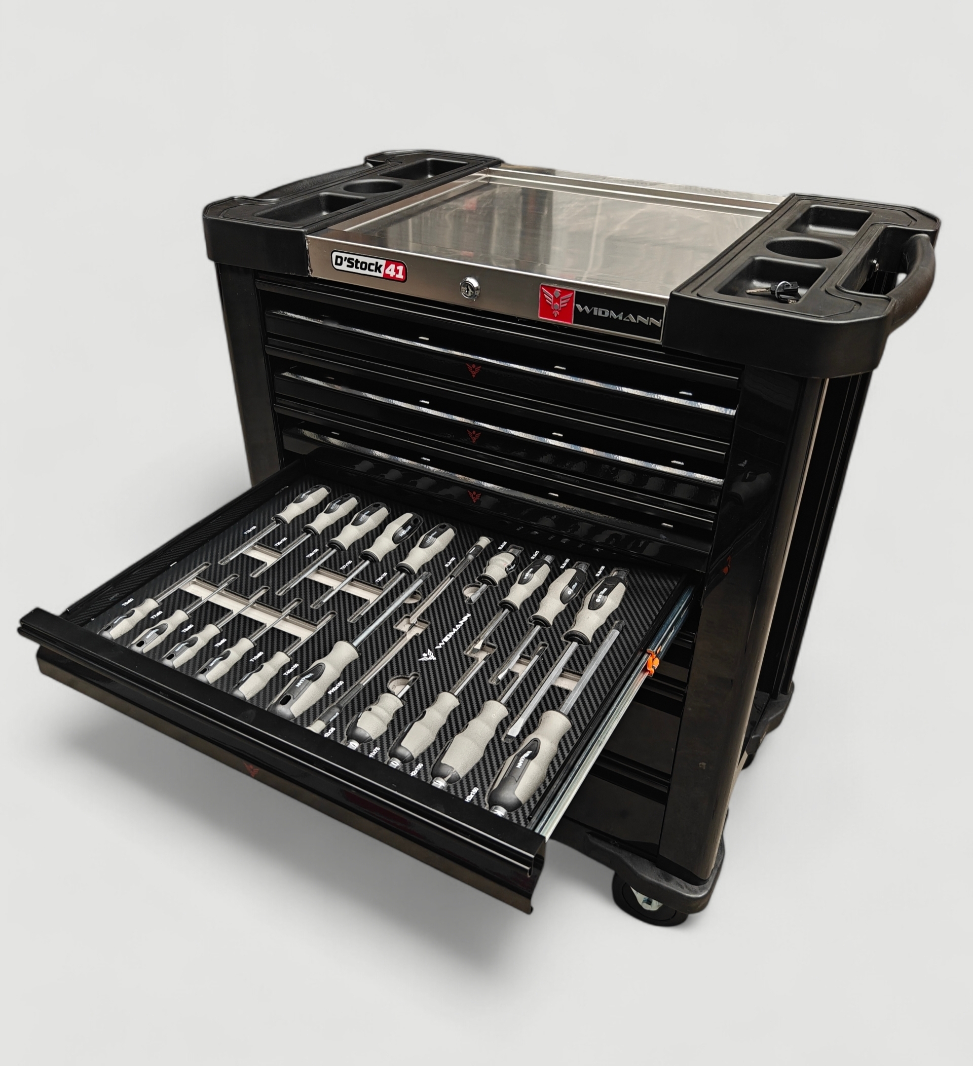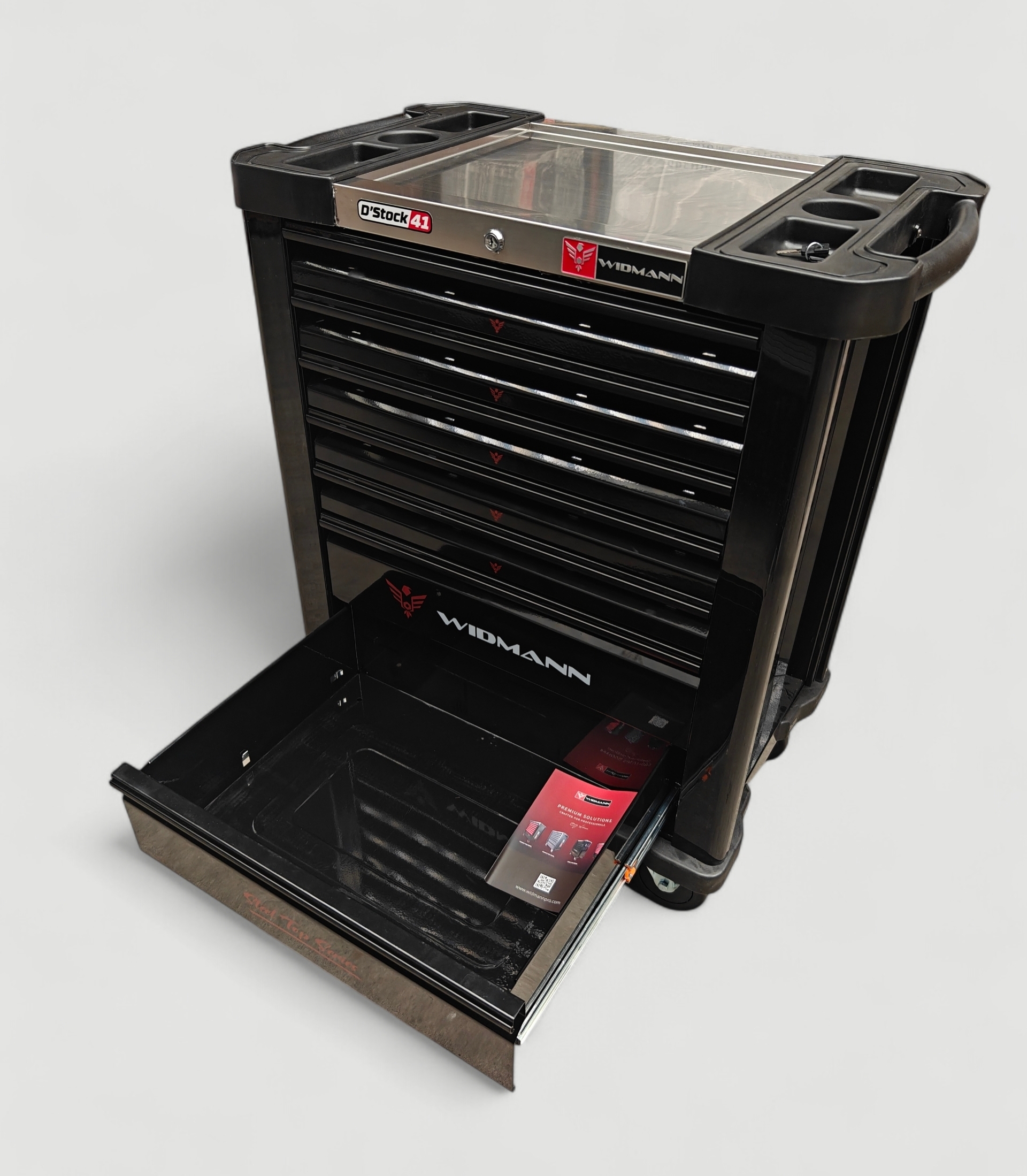 Nouvelle Servante d’atelier de la marque WIDMANN. Nouveau modèle 2026 pro Steel Top avec 7 tiroirs dont 6 complètement outillés, avec une clé dynamométrique 1/2. PRO STEEL TOP SERIE.
