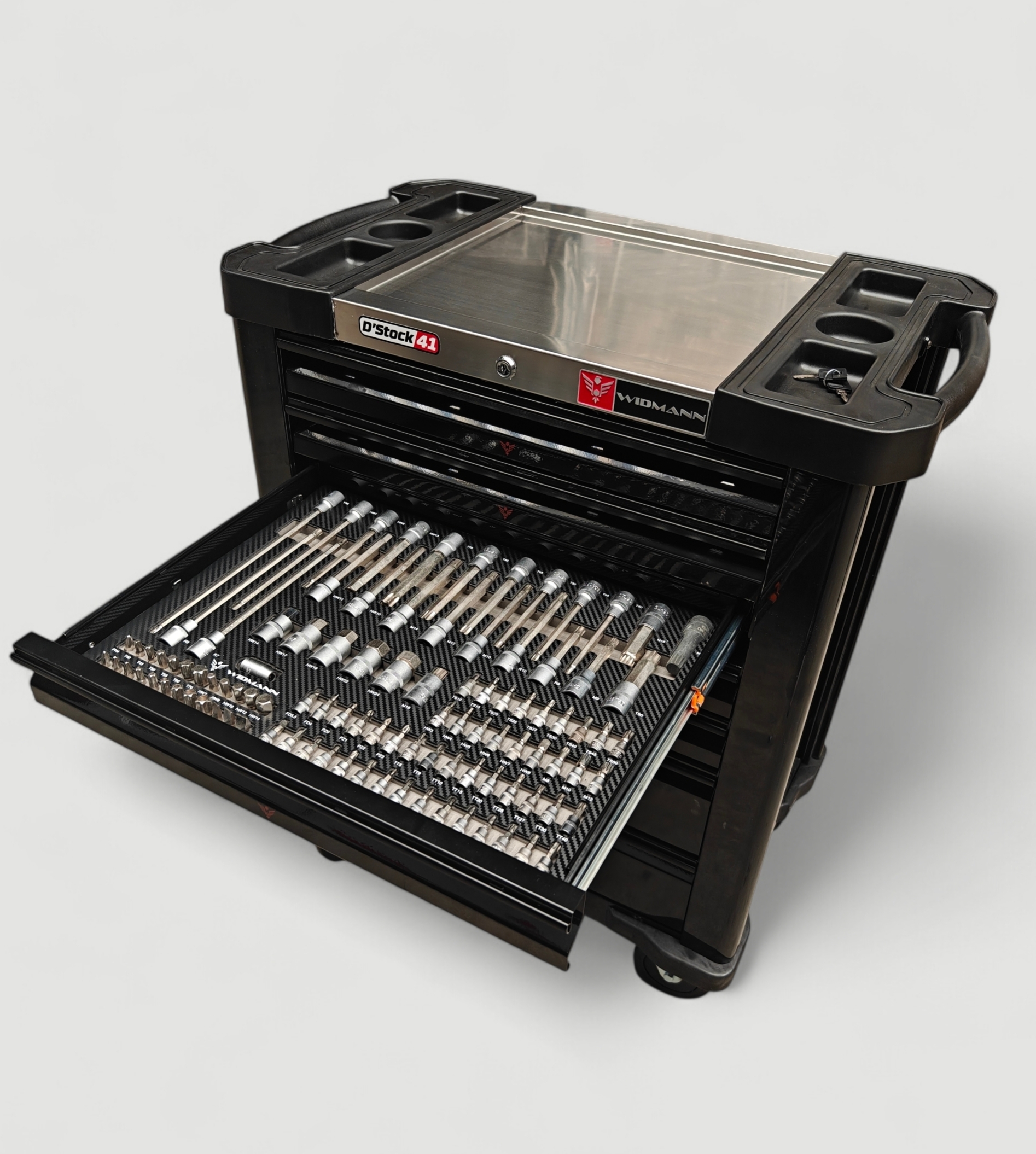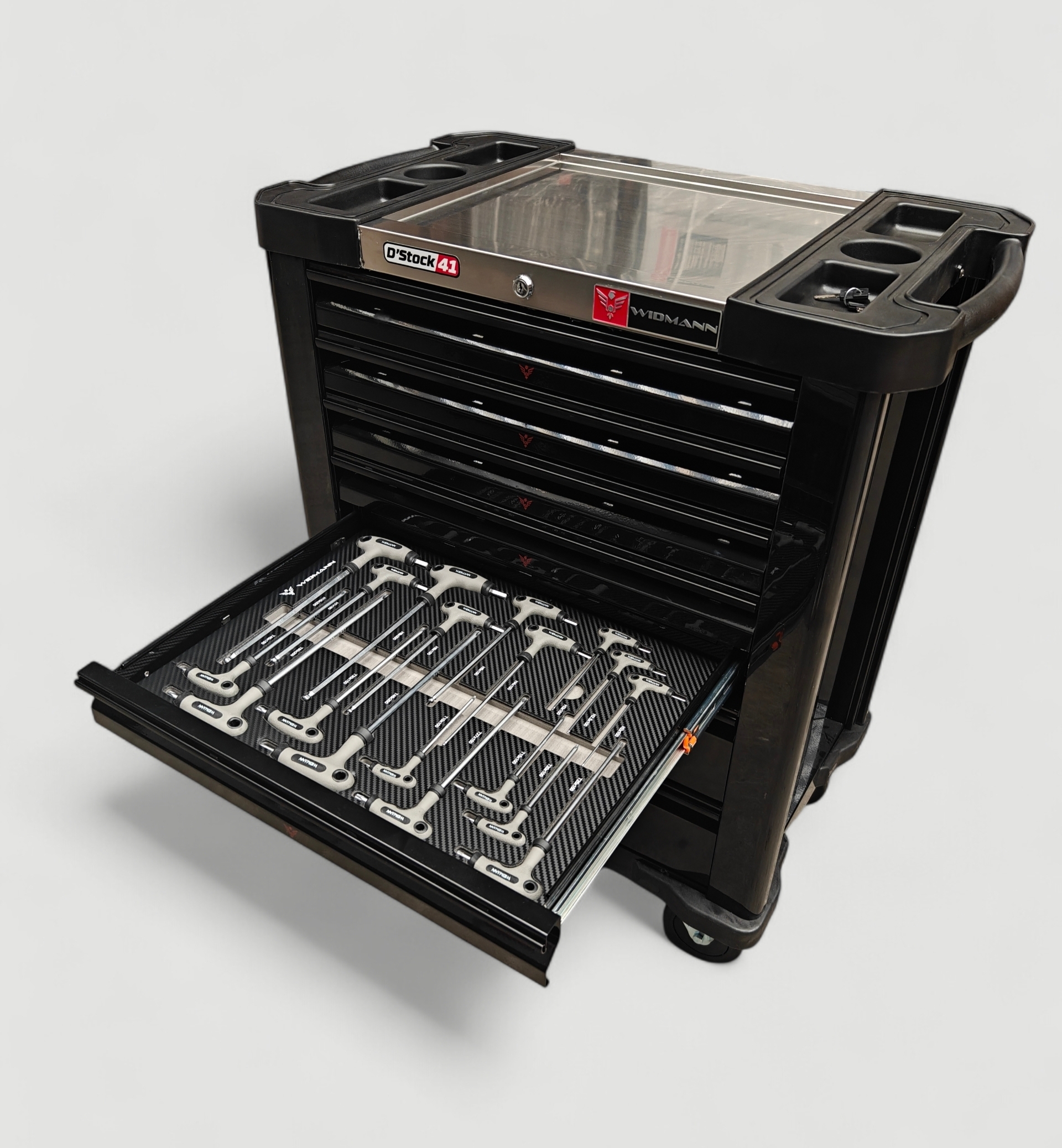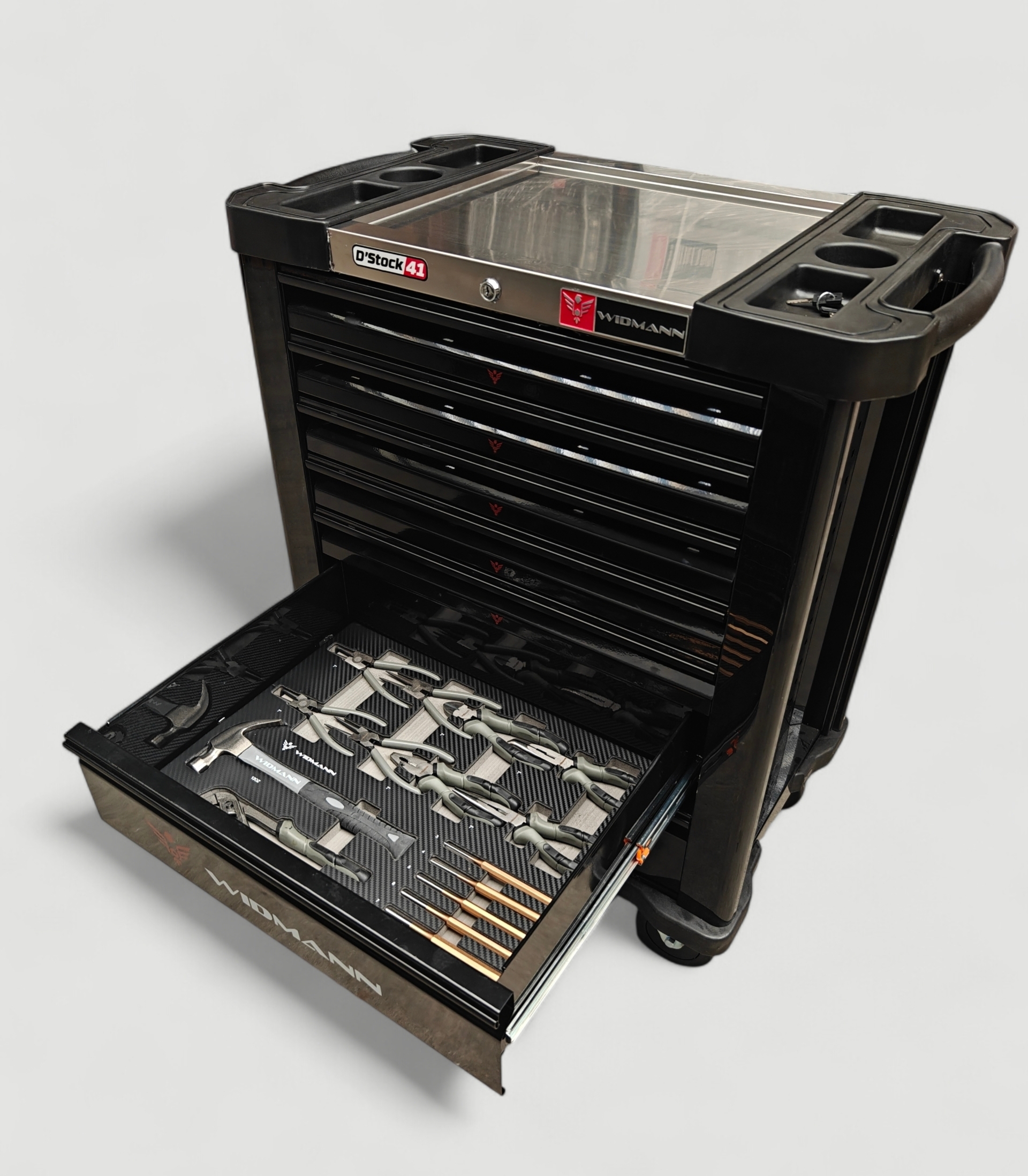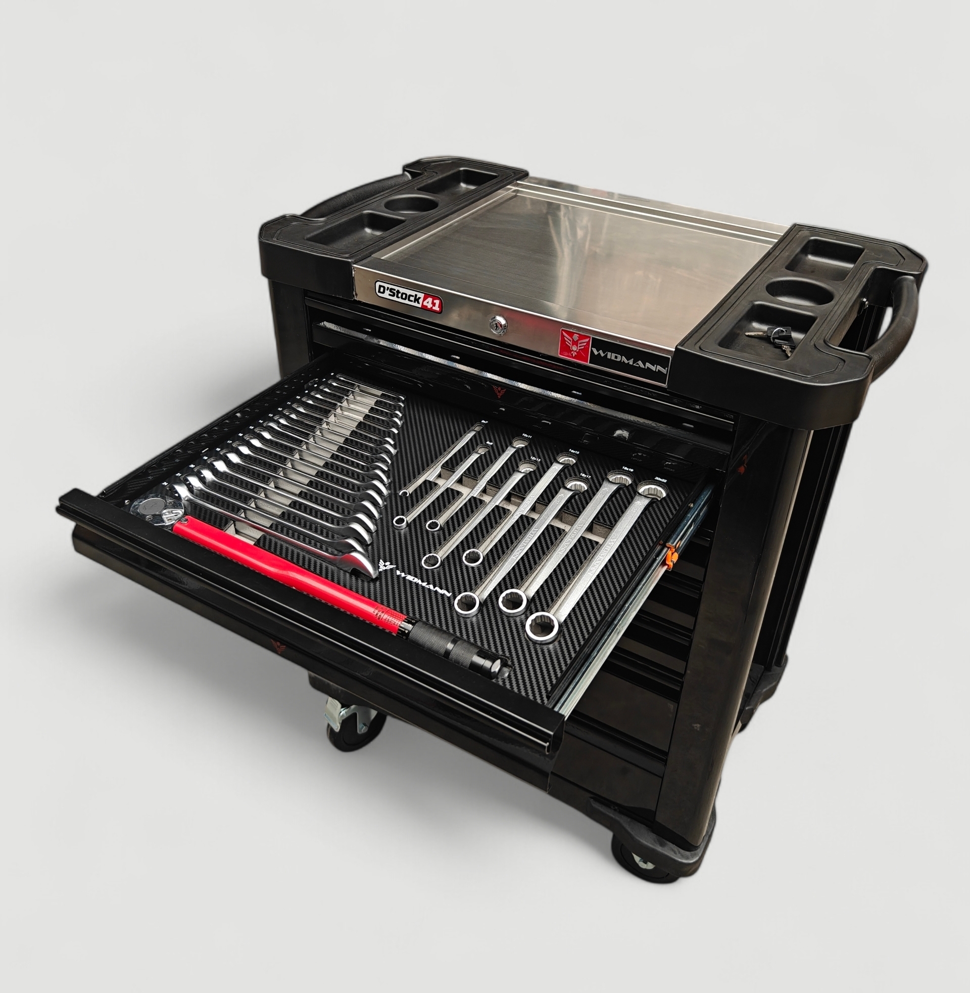 Nouvelle Servante d’atelier de la marque WIDMANN. Nouveau modèle 2026 pro Steel Top avec 7 tiroirs dont 6 complètement outillés, avec une clé dynamométrique 1/2. PRO STEEL TOP SERIE.